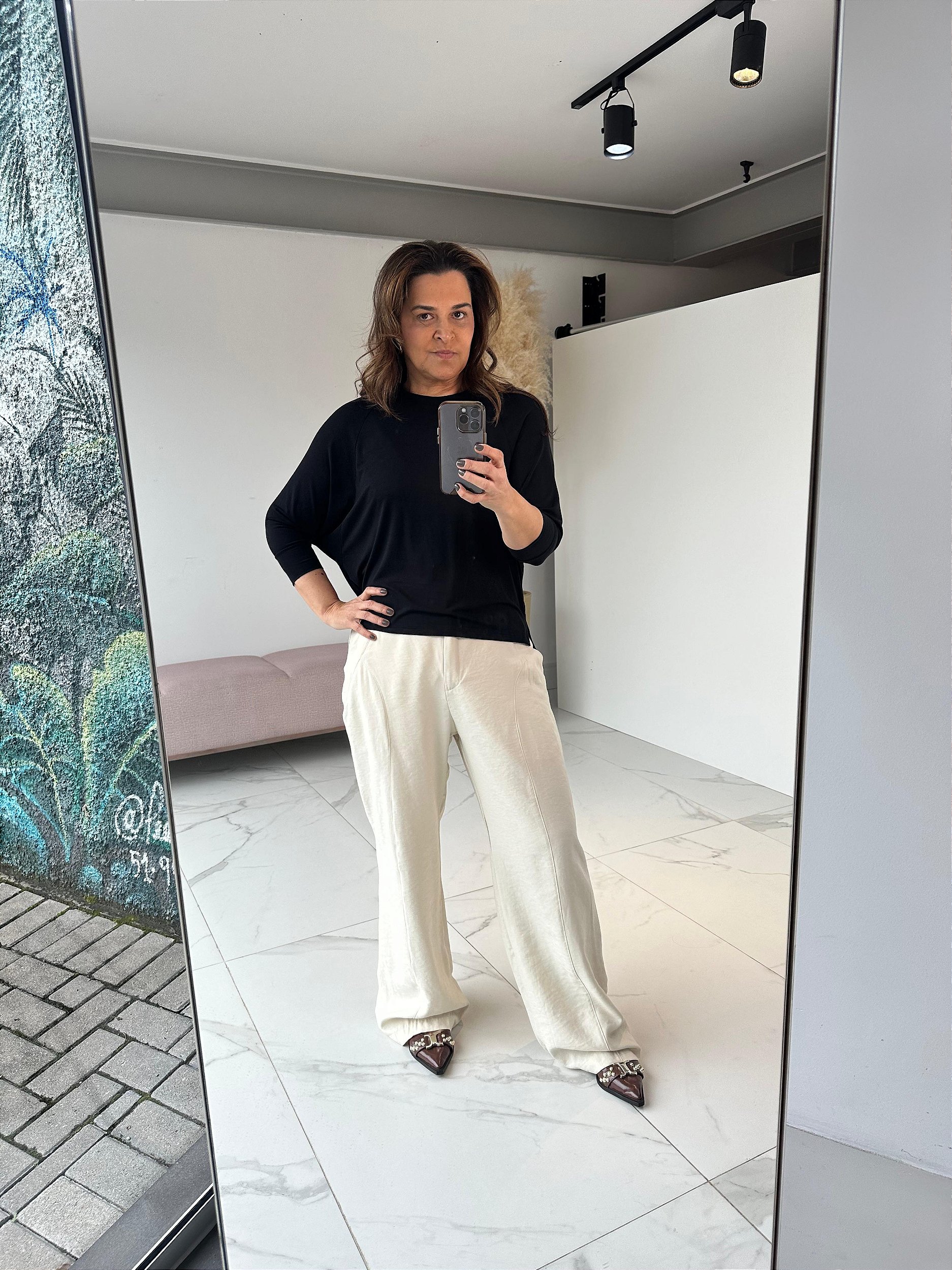 Blusa feminina em malha leve e confortável. Possui gola redonda clássica e mangas morcego em 3/4, que adiciona charme e praticidade ao visual. Corte reto na barra dá um ar moderno e minimalista. É uma peça versátil e elegante, perfeita para composições casuais ou mais sofisticadas, dependendo da produção. Ideal para quem busca conforto aliado a um estilo atemporal.