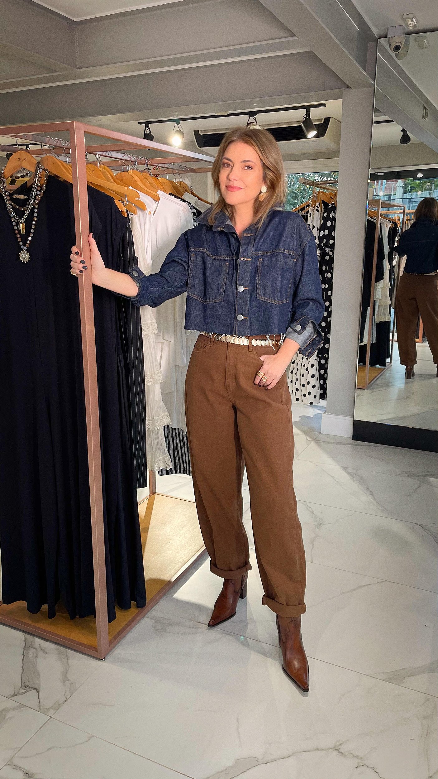 Calça de modelagem barril, confeccionada em tecido de sarja que garante caimento estruturado e elegante. Possui cintura média com cós tradicional, bolsos funcionais e fechamento por zíper e botão frontal. A barra pode ser usada solta ou dobrada, trazendo versatilidade ao styling. O tom neutro é sofisticado, ideal para composições modernas e atemporais.