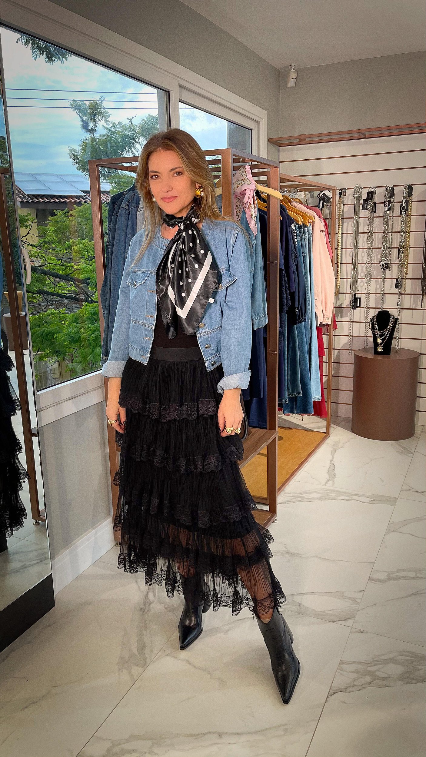 Saia longa em camadas, confeccionada em tecido leve e fluido. O destaque fica por conta das aplicações em renda delicada, que criam movimento e transparência sofisticada, trazendo um ar romântico e elegante. O cós é liso e estruturado, de elástico, garantindo ajuste confortável e valorizando a silhueta. Versátil e cheia de estilo, é perfeita para produções que vão do casual chic ao sofisticado, dependendo da combinação de peças e acessórios.