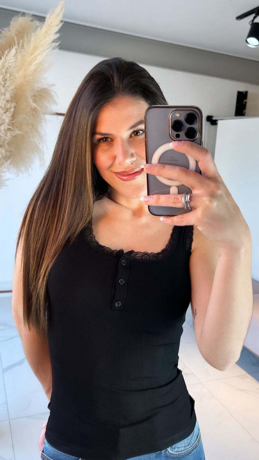 Regata canelada, com modelagem justa que valoriza a silhueta. Possui detalhe em renda delicada no decote e nas alças, além de botões frontais que trazem um toque romântico e feminino à peça. Confortável e versátil, pode ser usada sozinha em looks casuais ou em composições charmosas com sobreposições.