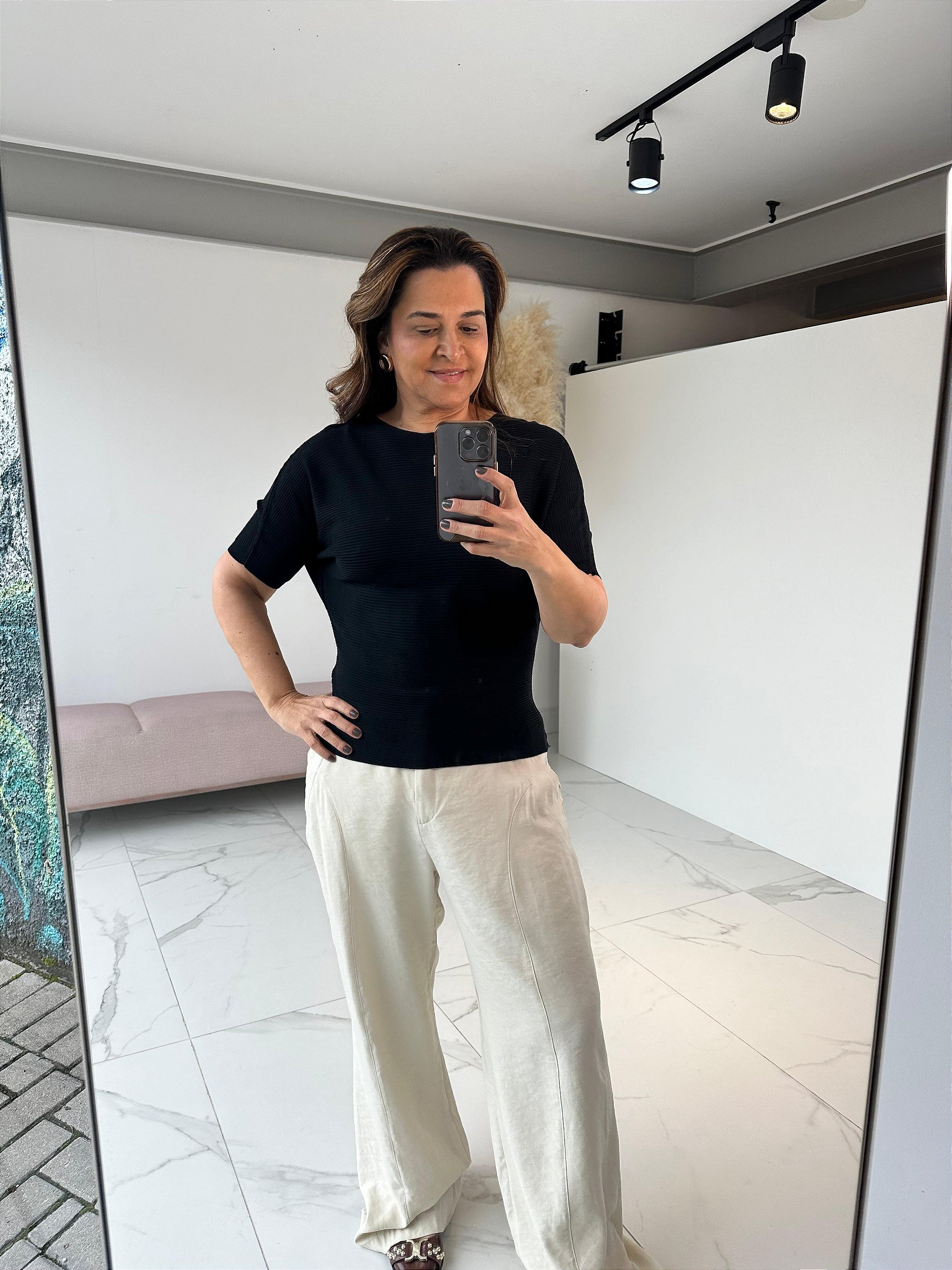 Blusa em modal leve e confortável, confeccionada em modelagem ajustada na cintura que garante caimento soltinho e elegante. O design conta com decote canoa, que valoriza os ombros, e mangas curtas com caimento moderno. A peça apresenta textura em linhas horizontais sutis, trazendo sofisticação ao visual. Versátil e atemporal, é perfeita para compor produções casuais ou sofisticadas, dependendo da combinação de acessórios e peças de apoio. Tamanho Único.