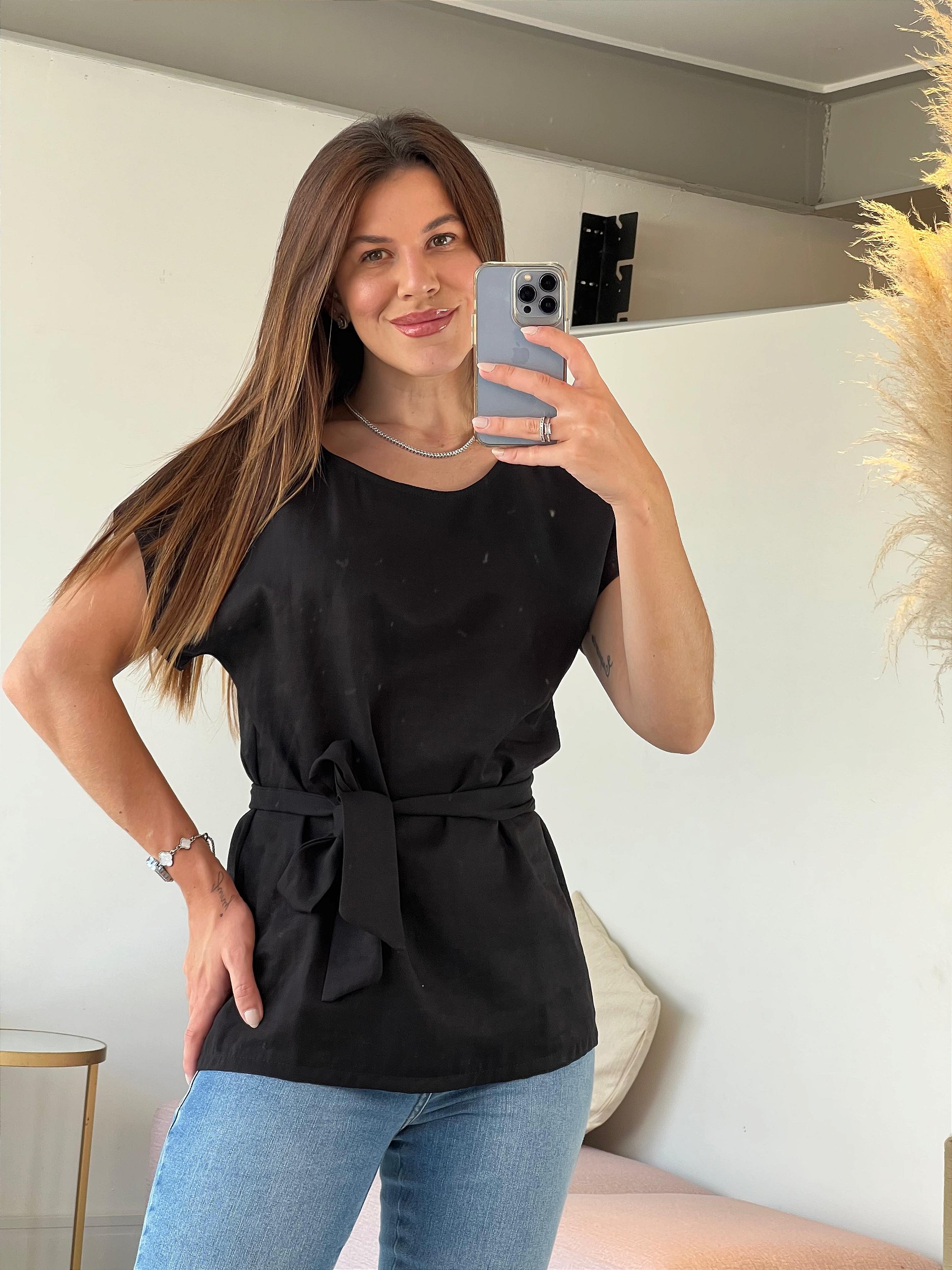 Elegante na medida certa, a Blusa Ana Alice é daquelas peças que transformam o básico em sofisticado. Com modelagem reta e manga levemente ampla, ela ganha destaque pelo detalhe da faixa para amarração na cintura, que valoriza a silhueta e permite diferentes formas de uso.
