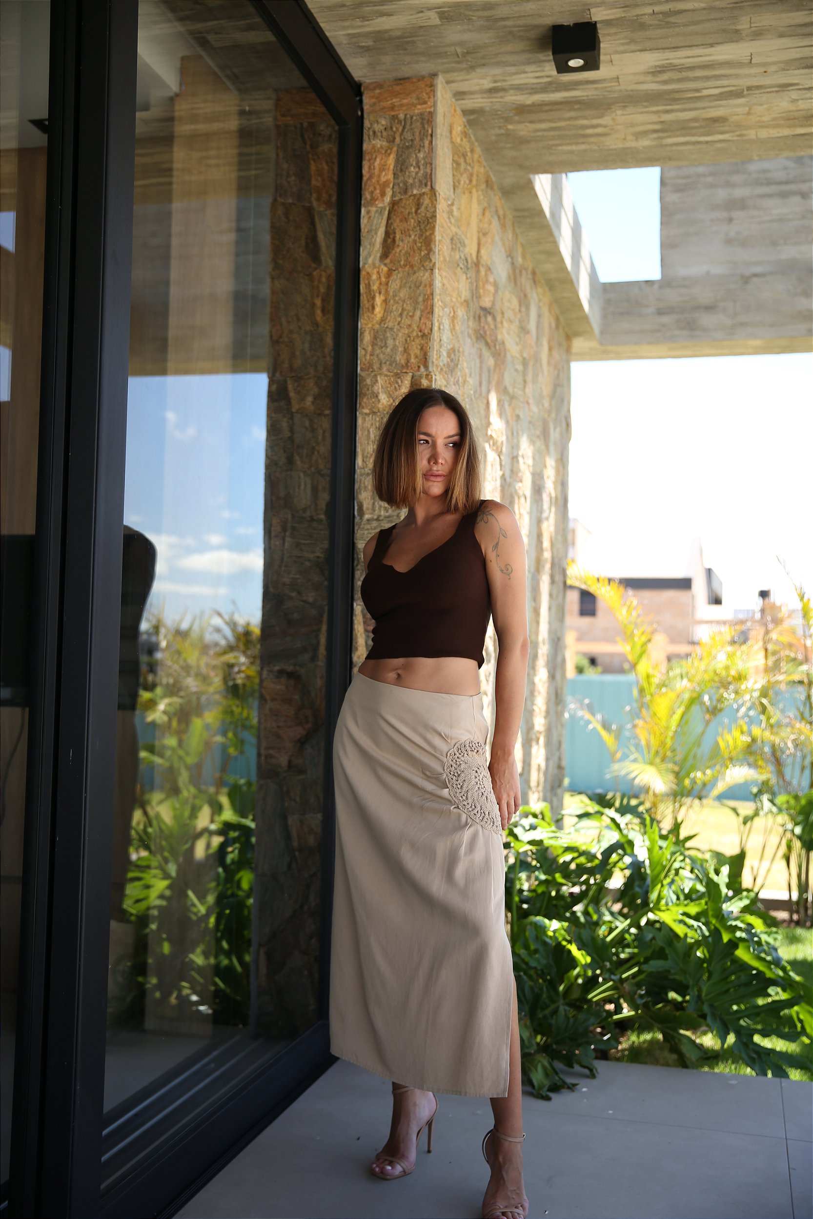 O destaque fica por conta da aplicação em crochê artesanal na lateral, que adiciona textura, exclusividade e um toque autoral ao design. A fenda lateral complementa a proposta, proporcionando leveza, movimento e sensualidade na medida certa.