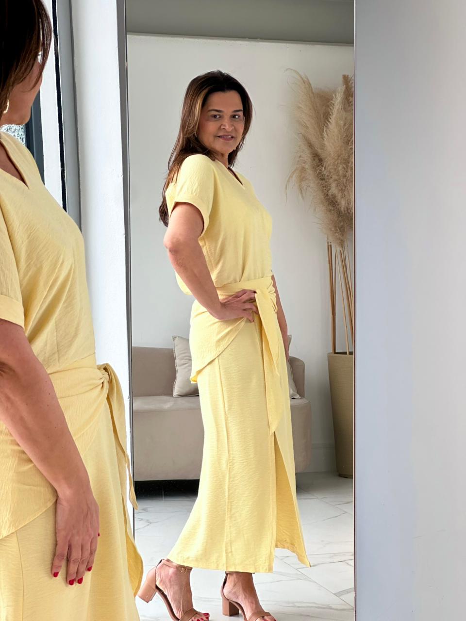 O Conjunto Juliana é composto por blusa e saia midi em tecido leve e fluido, com toque macio e excelente caimento. A blusa de modelagem reta possui decote em “V” e mangas curtas amplas, garantindo conforto e um visual clean. A saia midi tem fenda frontal sutil e acompanha lenço-faixa no mesmo tecido, que pode ser amarrado na cintura, valorizando a silhueta e adicionando um toque de estilo. Um look versátil, perfeito para ocasiões casuais elegantes ou eventos sofisticados.