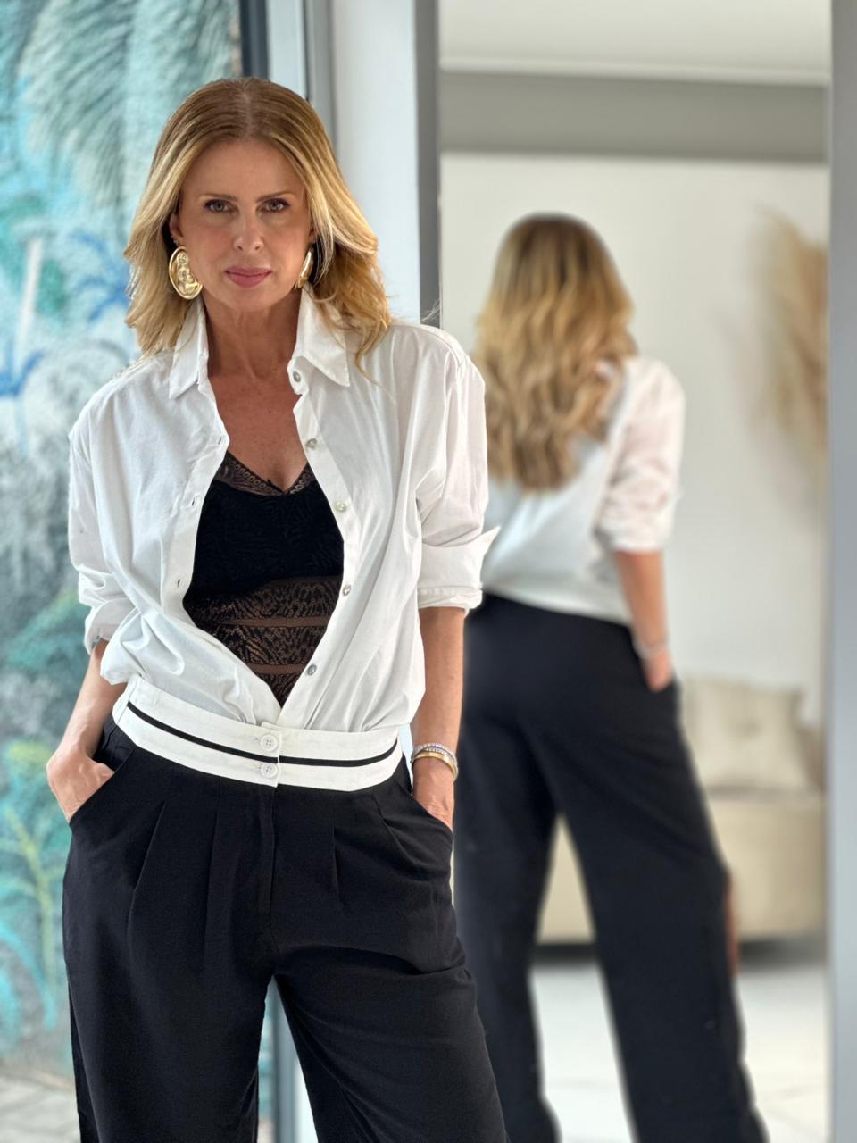 Calça feminina bicolor confeccionada em tecido leve com caimento fluido e toque macio. Possui modelagem reta e cintura alta, valorizando a silhueta com elegância e conforto. O cós é o destaque da peça, com design bicolor e fechamento frontal por botões, trazendo um ar moderno e sofisticado. Conta ainda com pregas frontais sutis e bolsos laterais funcionais, que adicionam praticidade ao visual. Versátil e atemporal, é perfeita para compor looks elegantes com camisas, croppeds ou blusas de alfaiataria.