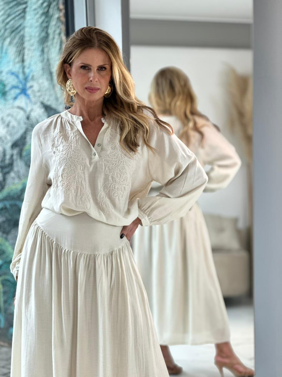 Blusa bordado boho em tecido leve e fluido, com modelagem ampla que proporciona conforto e movimento. Possui bordado delicado na parte frontal, que adiciona charme artesanal à peça. O decote é em formato “V” com abotoamento curto, e as mangas longas têm punhos com botão, conferindo um toque elegante. Uma peça sofisticada e atemporal, perfeita para compor looks casuais ou mais refinados.
