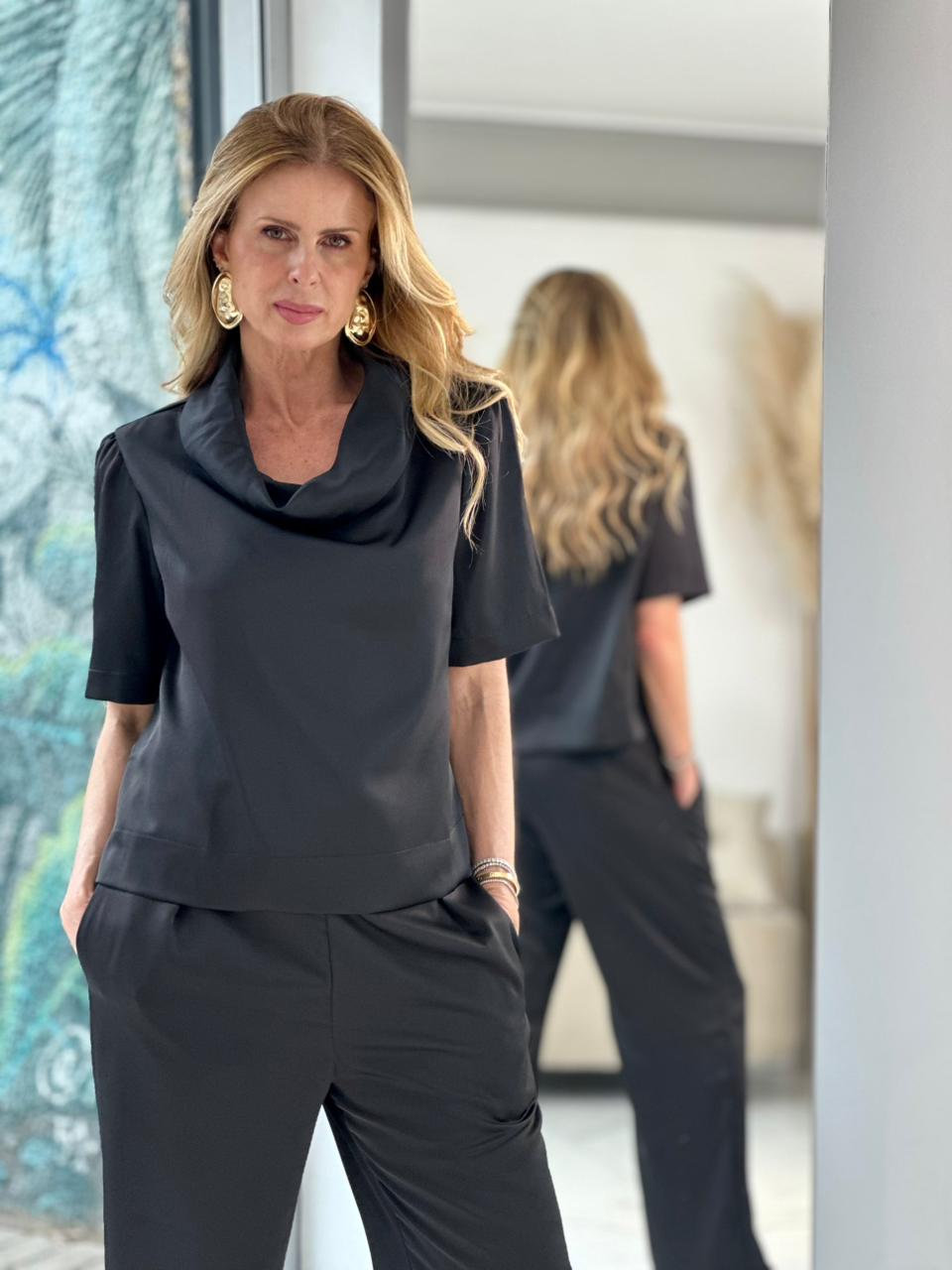 Conjunto Ester em tecido acetinado com toque leve e caimento elegante. A blusa possui gola ampla drapeada, mangas curtas e modelagem reta que valoriza o corpo com conforto. A calça tem cintura média, bolsos laterais e corte reto, trazendo movimento e sofisticação ao look. Um conjunto versátil, ideal para compor produções modernas e refinadas em qualquer ocasião.
