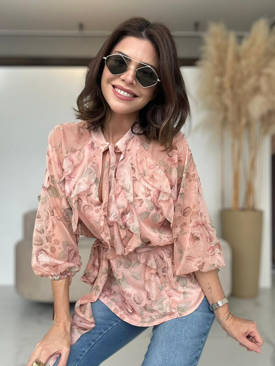 A blusa Andrea tem tecido leve e fluido, com toque suave e caimento delicado. O destaque fica por conta dos babados frontais, que trazem movimento e feminilidade à peça. Possui decote em “V” e mangas 3/4 amplas, garantindo conforto e um visual elegante. Ideal para compor produções refinadas, seja com calça de alfaiataria ou saias leves.