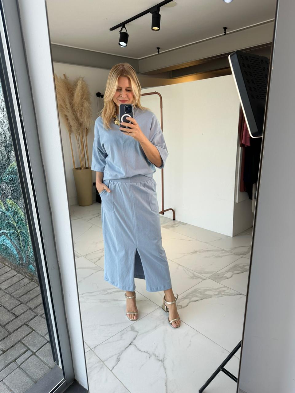 O equilíbrio ideal entre conforto e sofisticação. O conjunto Lisiane em malha leve é composto por blusa de modelagem soltinha com mangas amplas e saia midi com cós elástico, que valoriza a silhueta sem apertar. O caimento é fluido e elegante, garantindo liberdade de movimento e um visual moderno.A fenda frontal traz um toque de estilo e feminilidade, enquanto os bolsos laterais acrescentam praticidade ao look. Uma peça versátil que transita facilmente entre o casual e o elegante — perfeita para usar com sandálias, tênis ou salto.