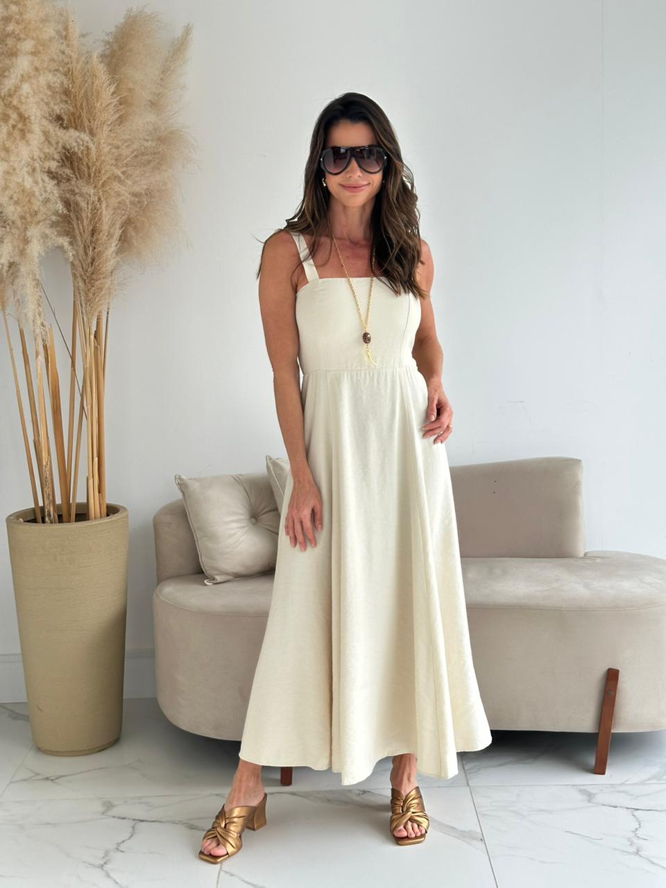Vestido longo em tecido leve com caimento fluido e toque suave.
