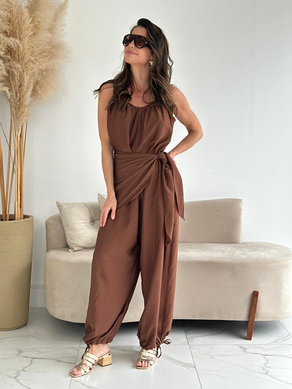 Macacão em tecido leve e fluido, com modelagem ampla e caimento impecável. O decote com leve franzido e as alças finas criam uma proposta feminina e elegante. Destaque para a amarração na cintura, pode ser usado solto ou com amarração que valoriza a silhueta e permite diferentes formas de uso. As barras ajustáveis trazem um toque moderno e descontraído, ficando ele aladim ou pode usar em amarrar ficando ele reto .. ideal para produções que unem conforto e estilo.