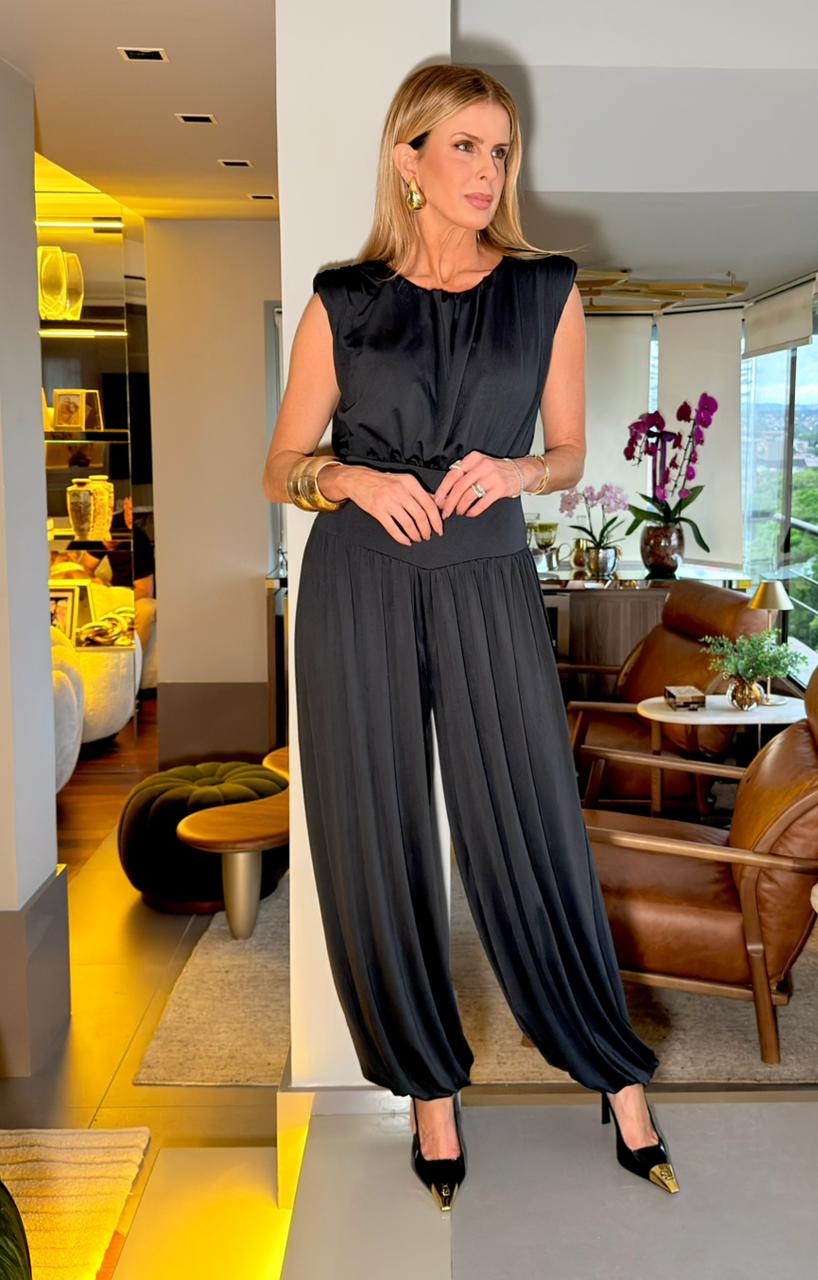O modelo apresenta decote fechado com leve drapeado no busto, cintura marcada que valoriza a silhueta e calça ampla com pregas sutis, trazendo movimento e fluidez ao look.
