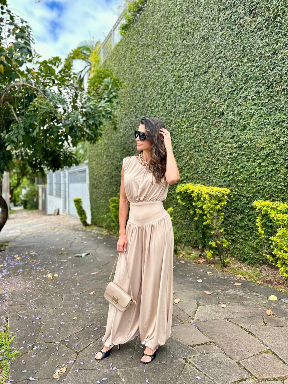 Macacão em fluity tecido 100% poliamida com caimento leve e toque sofisticado, ideal para ocasiões especiais ou produções elegantes de verão.