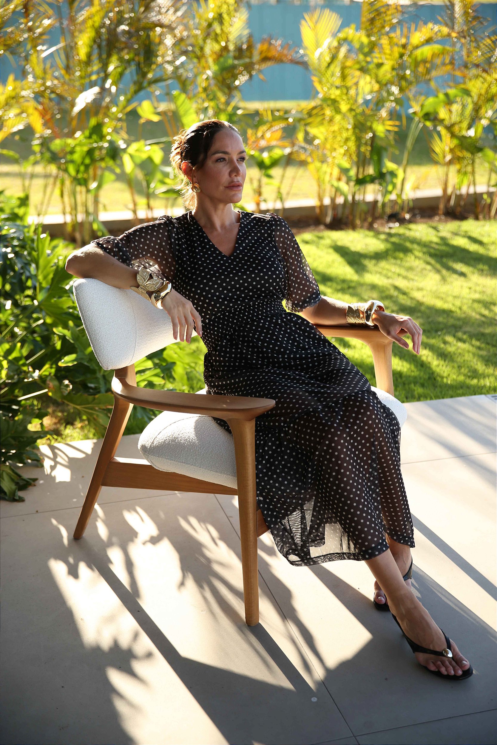 O Vestido Tule Marcele é a união perfeita entre elegância clássica e leveza feminina. Confeccionado em tule delicado com padronagem de poás, ele possui caimento fluido que acompanha a silhueta com suavidade, criando um visual sofisticado e atemporal.
