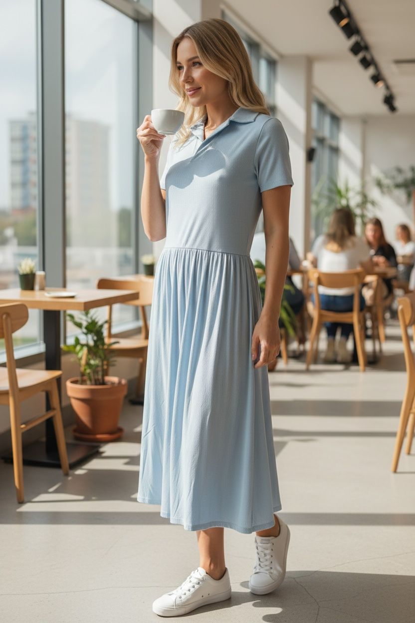 Vestido midi em malha com modelagem confortável e caimento leve, perfeito para acompanhar a rotina com praticidade e estilo. O modelo possui gola polo e mangas curtas, trazendo um toque esportivo e moderno à produção. A cintura levemente marcada valoriza a silhueta, enquanto a saia fluida garante movimento e elegância.