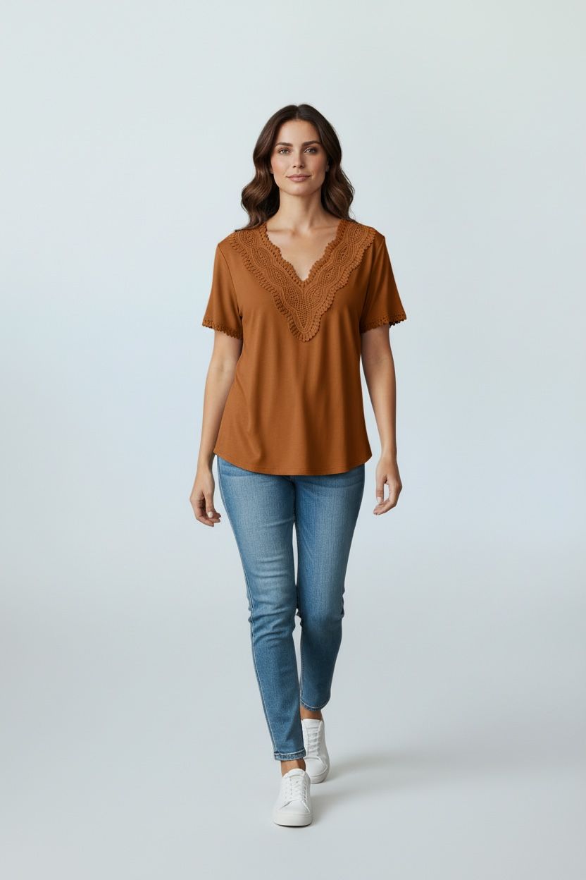 Elegante e feminina, a Blusa Decote V Guipir é perfeita para valorizar produções com um toque sofisticado. Confeccionada em malha leve e confortável, possui modelagem reta que garante ótimo caimento e liberdade de movimentos. O destaque fica por conta do decote em V com aplicação de guipir, que acrescenta delicadeza e riqueza de detalhes à peça, além de valorizar o colo de forma sutil.