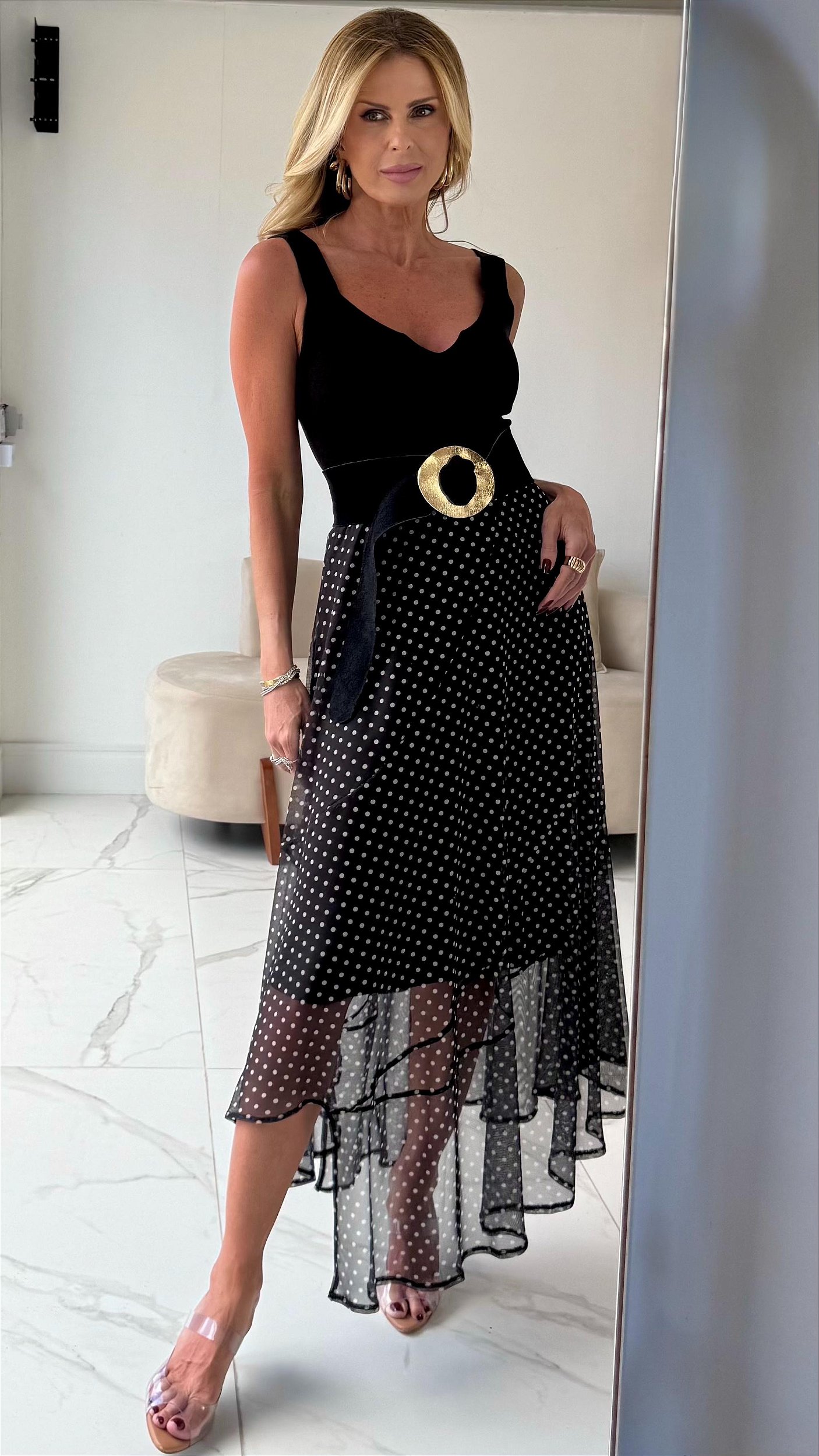 Saia Tule Poá Preto - Movimento, leveza e elegância em cada detalhe.