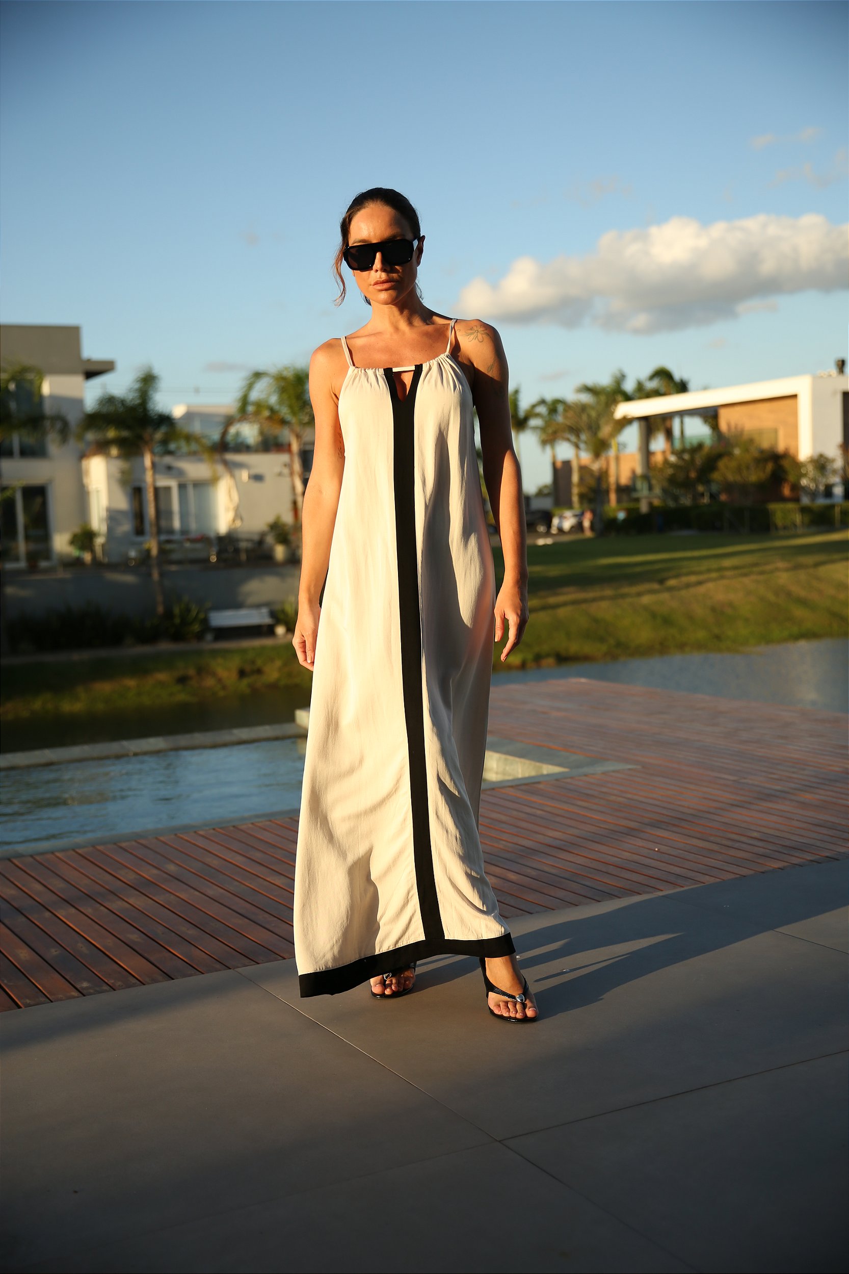 O Vestido Regata Ane é a união perfeita entre frescor, elegância e modernidade. Confeccionado em linho, ele oferece toque natural, leveza e um caimento impecável que valoriza o corpo com sofisticação. O contraste do bege com a faixa vertical preta cria um efeito alongador e acrescenta personalidade à peça, mantendo o visual clean e atemporal.