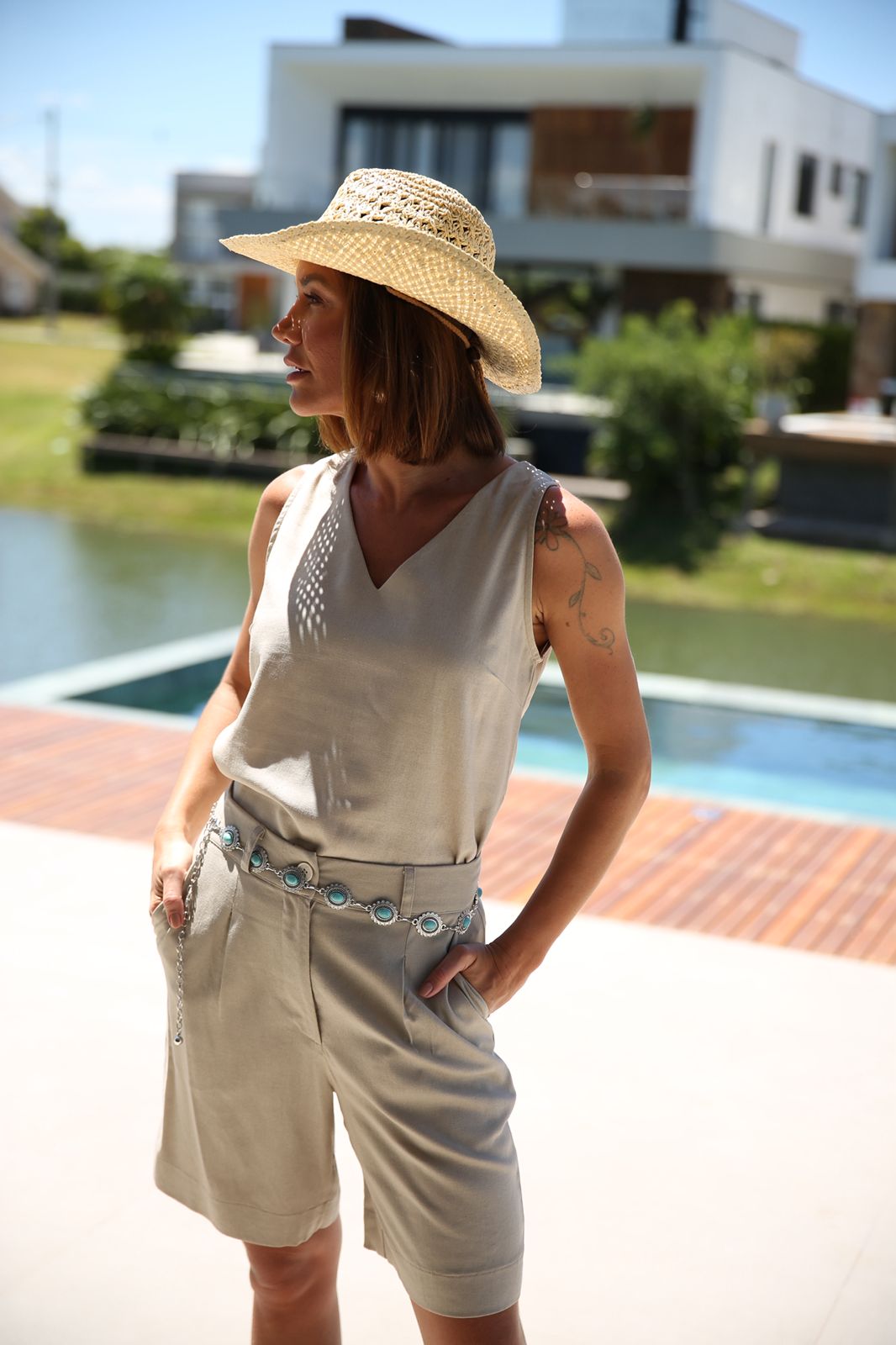Com modelagem reta e moderna, a Regata Georgia proporciona um visual elegante sem esforço. O decote clássico traz leve abertura, destacando delicadamente o colo e permitindo combinações com acessórios mais marcantes, como colares alongados e peças artesanais. O tecido em linho adiciona textura e movimento, elevando a regata a um nível mais sofisticado do que modelos básicos tradicionais.