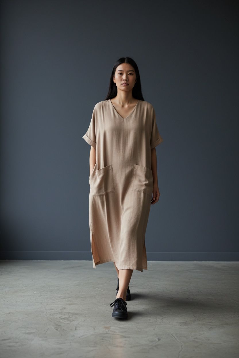 O Vestido Linho Clara é a definição de elegância descomplicada. Com modelagem reta e comprimento midi, traz decote em V que valoriza o colo e mangas amplas que garantem conforto e leveza ao vestir. Os bolsos frontais adicionam funcionalidade sem perder a sofisticação, enquanto o tecido em linho proporciona um caimento natural e fresco.