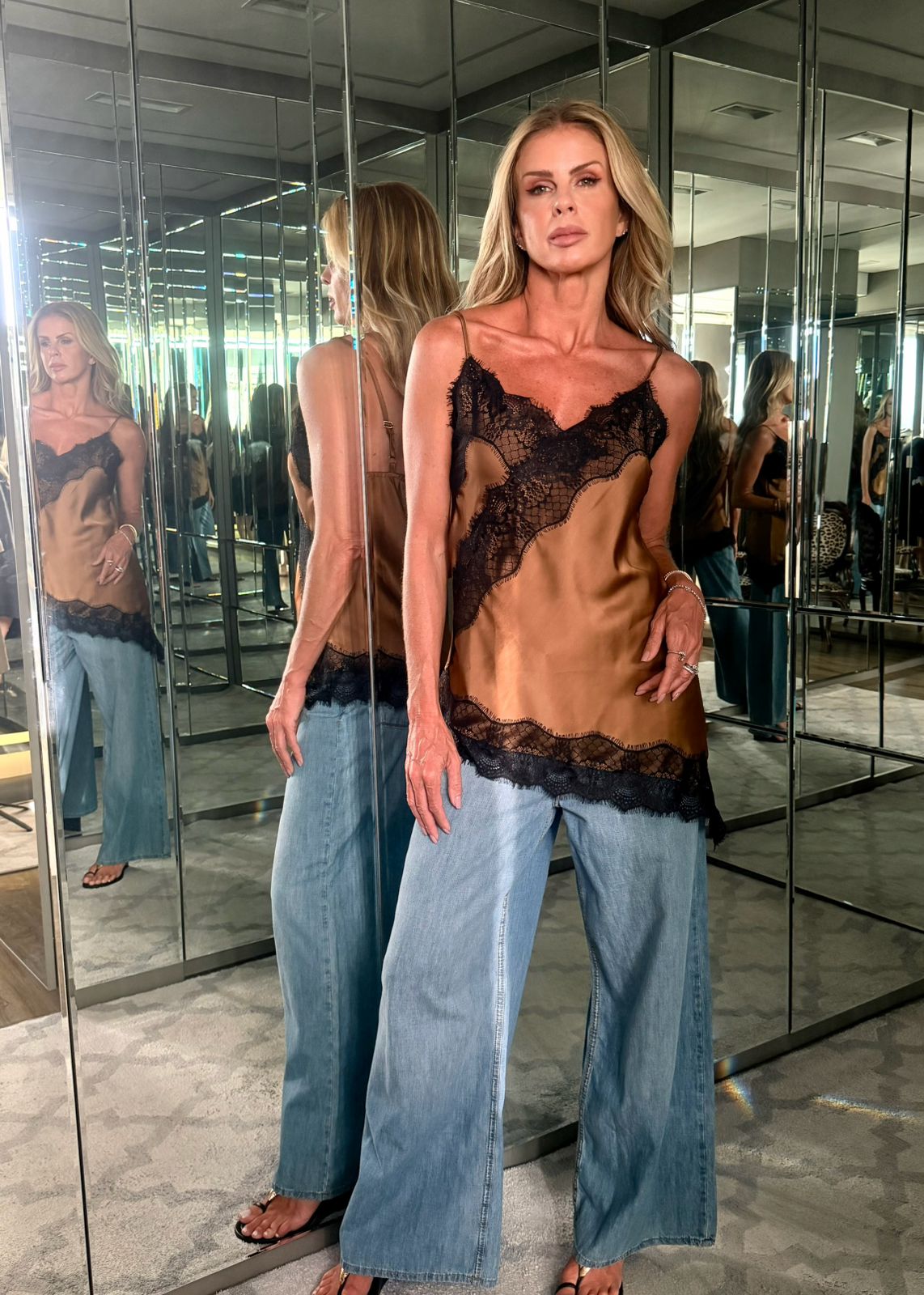 Sofisticada e feminina, a regata acetinada é aquela peça essencial que transforma qualquer produção. Com toque suave e brilho delicado, o tecido traz elegância instantânea, enquanto os detalhes em renda preta adicionam um ar sensual e refinado ao look.
