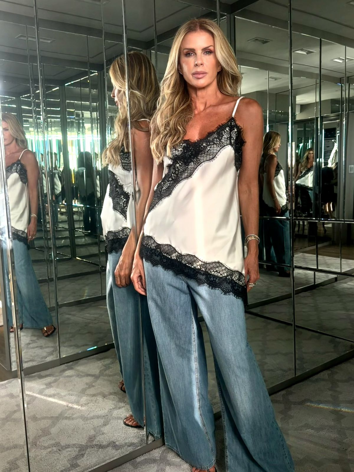 Sofisticada e feminina, a regata acetinada é aquela peça essencial que transforma qualquer produção. Com toque suave e brilho delicado, o tecido traz elegância instantânea, enquanto os detalhes em renda preta adicionam um ar sensual e refinado ao look.