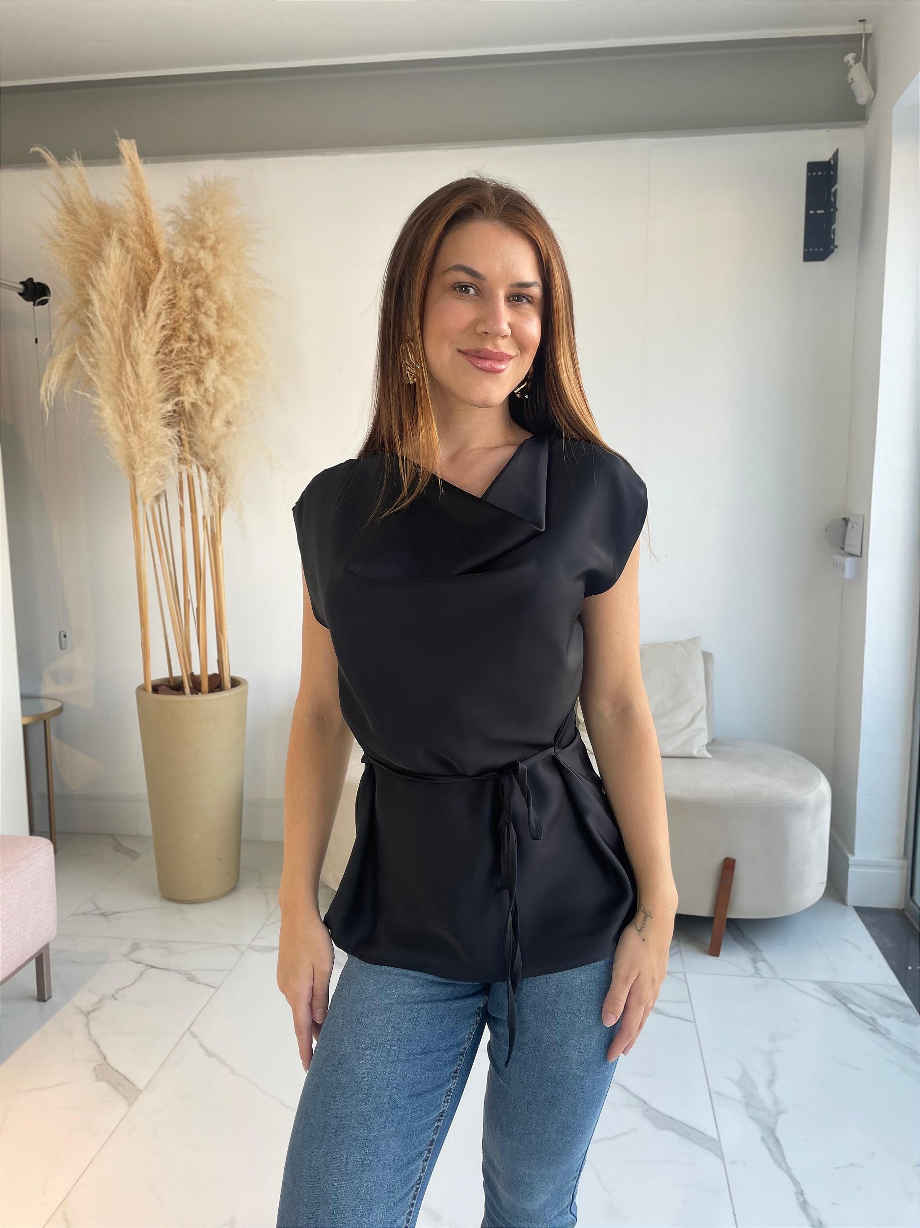 O detalhe na cintura proporciona ajuste elegante, criando uma proposta feminina e refinada. Ideal para compor looks com alfaiataria para ocasiões especiais ou combinar com jeans para um visual chic e descomplicado.