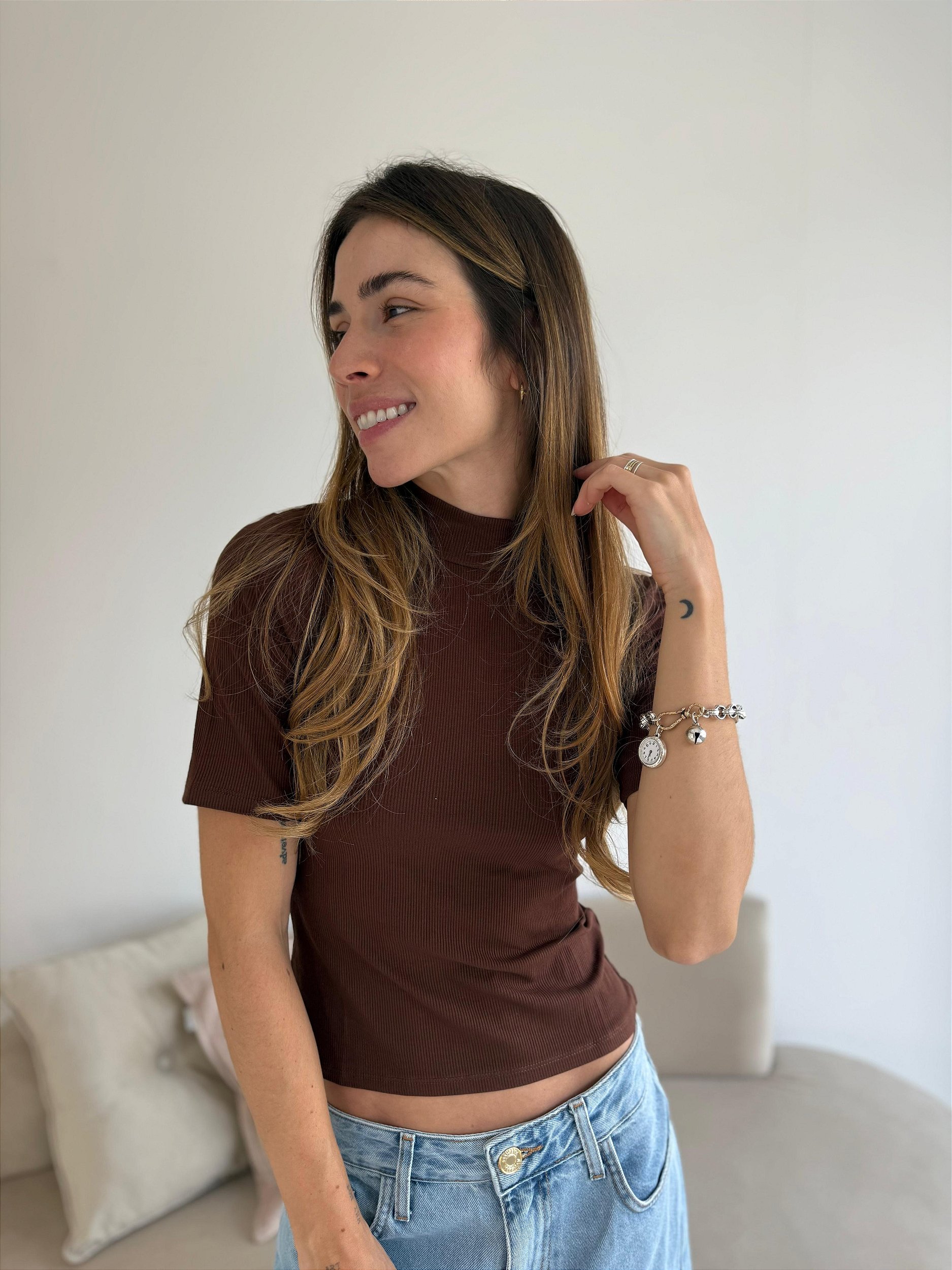 Confeccionada em malha canelada de toque macio, proporciona conforto, elasticidade e ótimo caimento. Versátil e atemporal, combina facilmente com jeans, alfaiataria ou saias, sendo perfeita tanto para looks casuais quanto para composições mais sofisticadas.