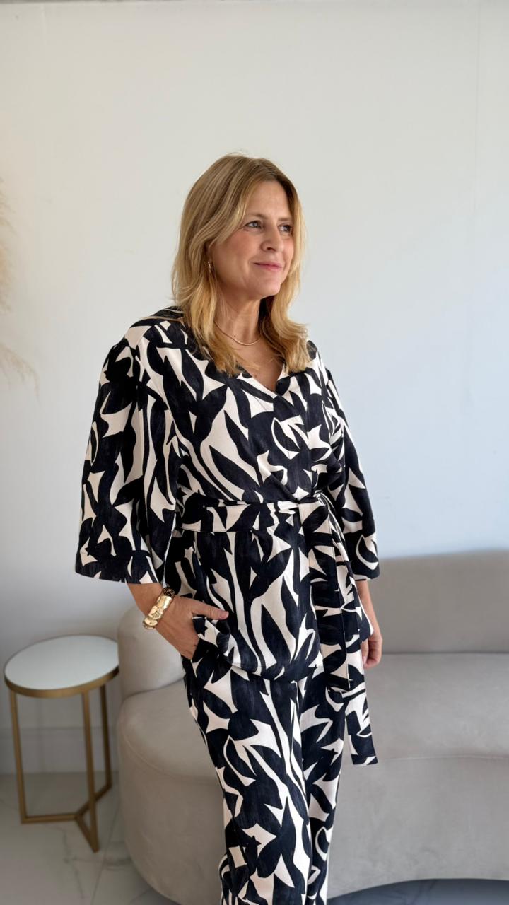 Elegante e cheio de personalidade, o Kimono Raquel é a peça perfeita para transformar qualquer look. Com modelagem fluida e amarração na cintura, ele valoriza a silhueta com leveza e sofisticação. A estampa em contraste traz modernidade à produção, enquanto as mangas amplas garantem movimento e conforto.