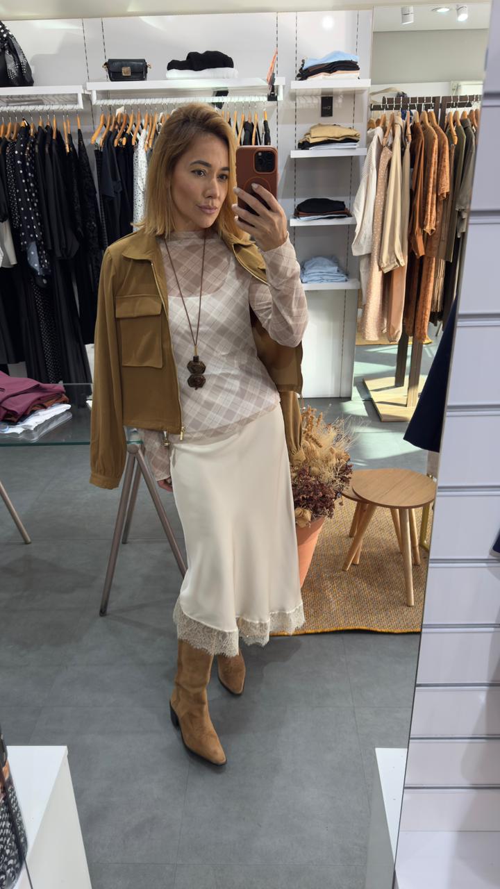 Sofisticada e feminina, a Saia de Cetim com Renda é a escolha perfeita para composições elegantes e modernas. Confeccionada em cetim com toque suave e caimento fluido, a peça se destaca pelos delicados detalhes em renda, que trazem charme e um toque de romantismo ao look.