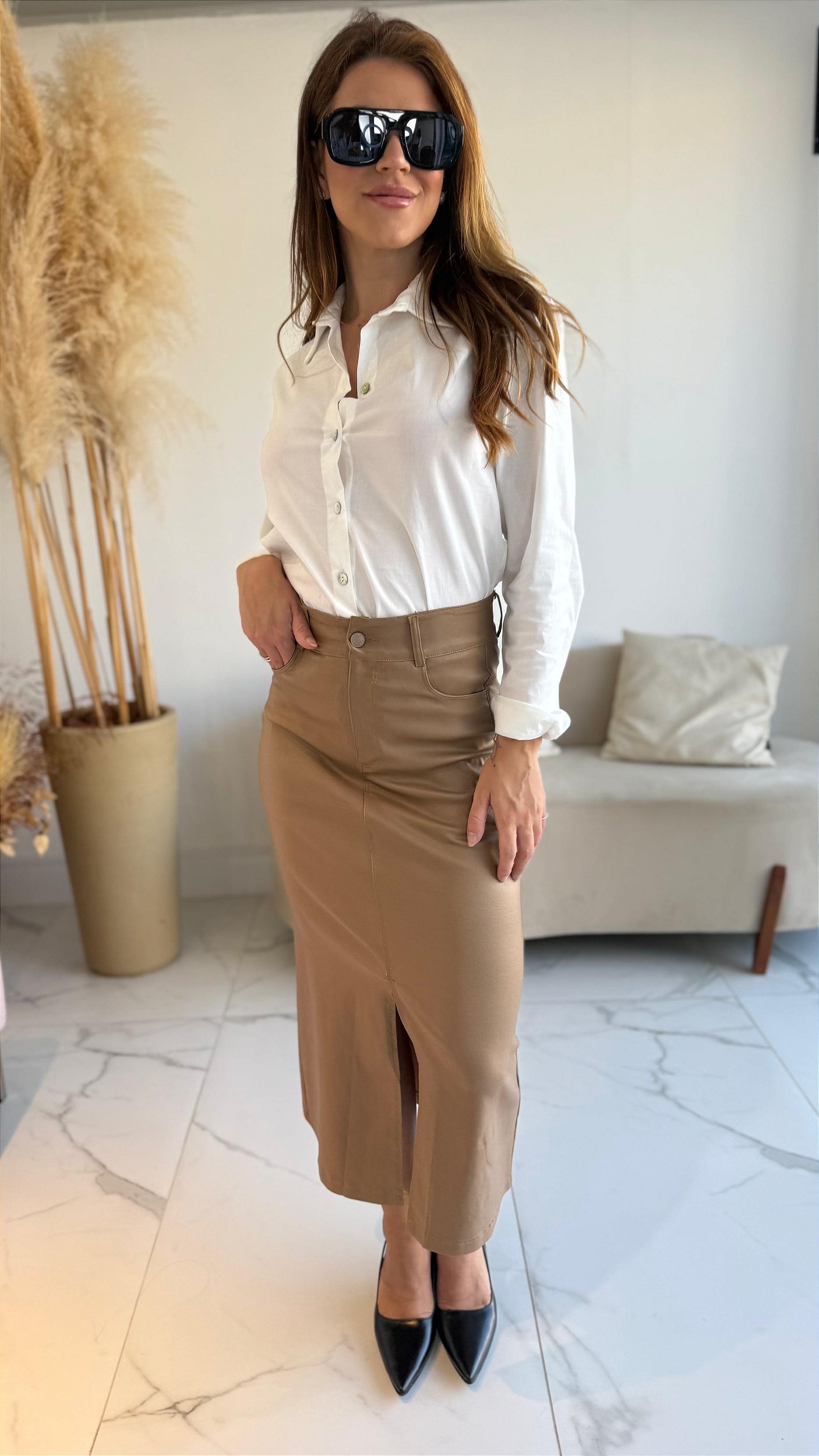 Com acabamento moderno e toque sofisticado, a saia resinada traz um visual contemporâneo que valoriza qualquer produção. Possui modelagem midi, cintura alta e caimento ajustado ao corpo, destacando a silhueta com elegância.
