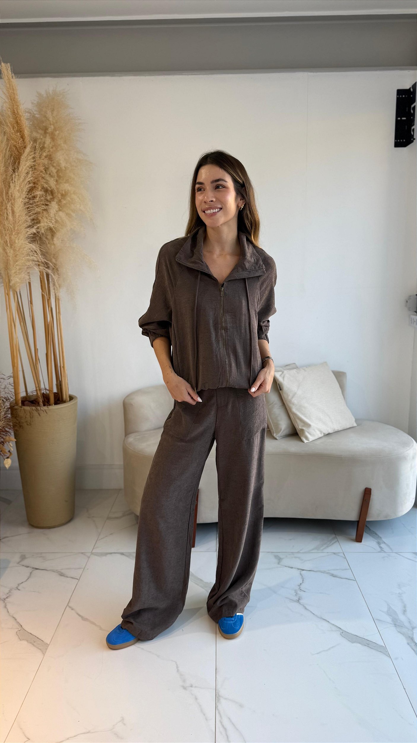A blusa com fechamento em zíper e detalhe de amarração valoriza o visual com um ar contemporâneo, enquanto a calça de modelagem ampla garante movimento e alonga a silhueta com naturalidade.