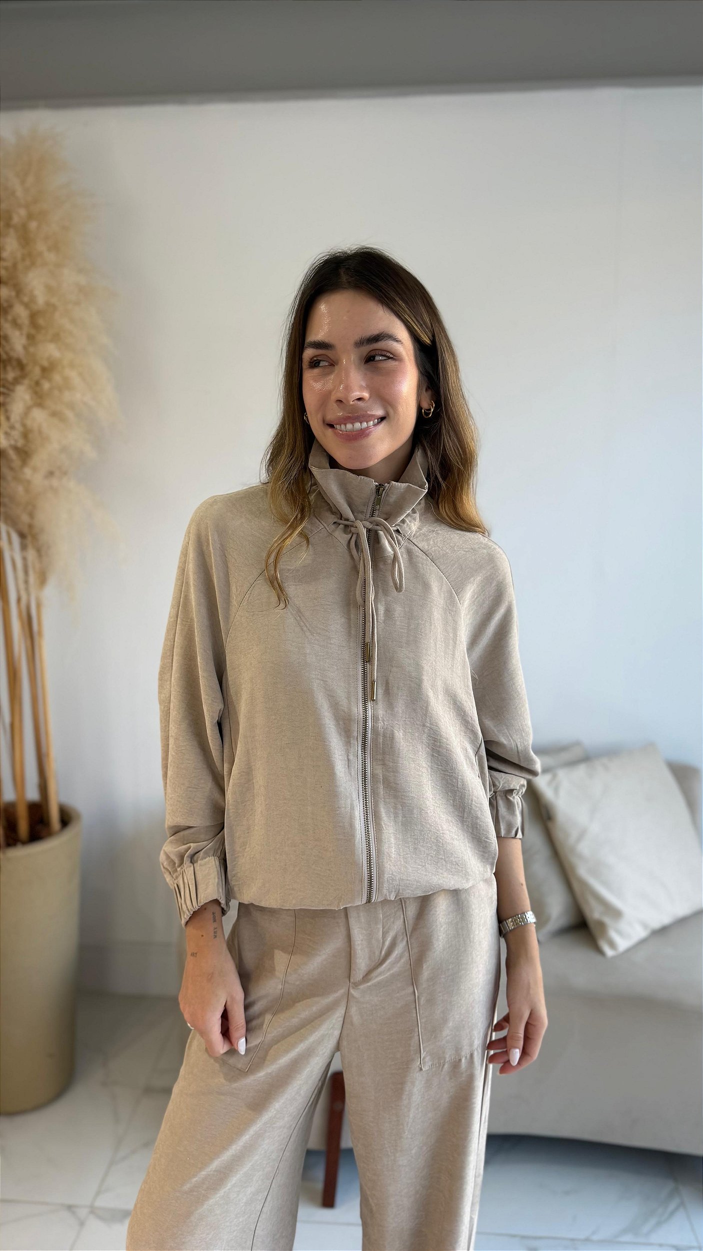 A blusa com fechamento em zíper e detalhe de amarração valoriza o visual com um ar contemporâneo, enquanto a calça de modelagem ampla garante movimento e alonga a silhueta com naturalidade.